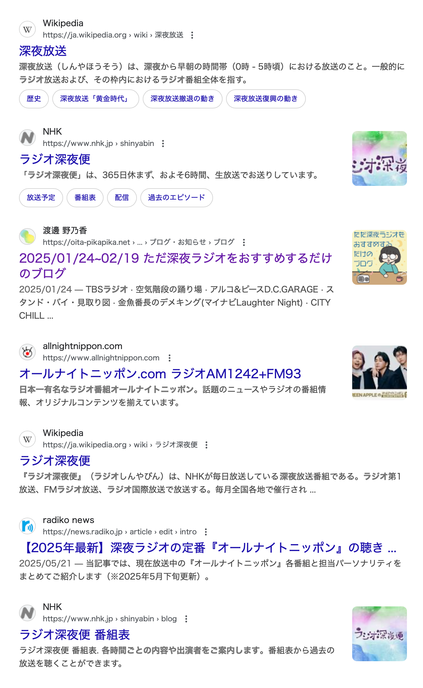 今「深夜ラジオ」でGoogle検索すると、オールナイトニッポンの公式HPよりも、私の書いたブログの方が上に出てくることに気付いてさすがに震えました…。なんかアクセス多いなとは思っていたのですが、ここまで上に出てくるとは…。 あと最近「ノート・手帳を自慢するブログ」のアクセスも多いなと思っていましたが、「手帳 ブログ」で検索すると上から3番目くらいにこのブログがヒットすることに気付きました。 私のサイトでアクセス多いのは実はイラストよりもブログなんですよね。イラストや作品をまとめようと思って作ったサイトなので複雑な気持ちではありますが、でもブログ書くのは楽しくて好きなんですよねぇ…まぁ読んだ人に楽しんでもらえてたらいいなぁと思っています。 2025/10/04